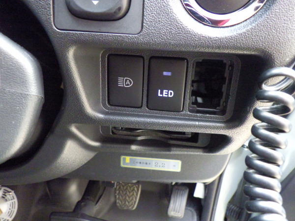パネルを開けて使用していないアクセサリースイッチを外して裏側に収納 外すには裏の爪を押して前面に押し出す 新たなスイッチに通電 電源はポータブル電源から スイッチを入れるとさらに光る もうひとつの穴は作業灯またはフォグランプ用でこれもポータブル電源から 山道や牽引用のシグナル