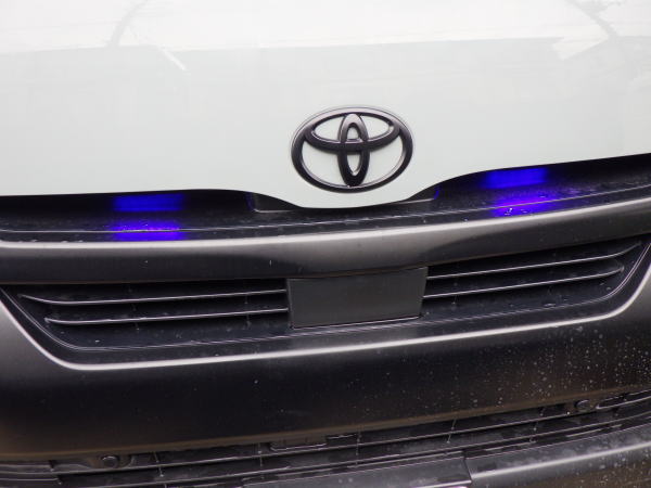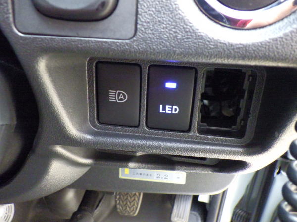 パネルを開けて使用していないアクセサリースイッチを外して裏側に収納 外すには裏の爪を押して前面に押し出す 新たなスイッチに通電 電源はポータブル電源から スイッチを入れるとさらに光る もうひとつの穴は作業灯またはフォグランプ用でこれもポータブル電源から 山道や牽引用のシグナル